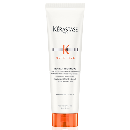 Nectar Thermique de Kérastase es una leche de secado anti-frizz para cabello seco medio a grueso. Esta leche capilar embellecedora protege el cabello seco del peinado con calor y contiene polímeros anti-sequedad para proporcionar nutrición, desenredado, s